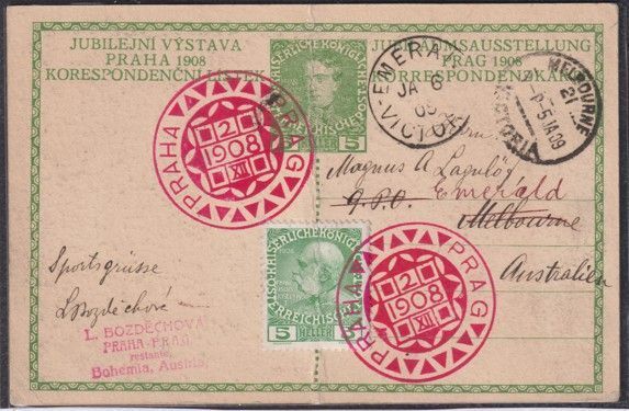 Červené razítko PRAG*PRAHA 2.XII.1908, německo – český text, na Výstavní dopisnici, vydání 1908 – česko – německý text, odesláno 2.12.1908 z Prahy do Melbourne (Austrálie), dosíláno , správný tarif : 5+5 hal.,příchozí razítka 5.+6.1.1909.