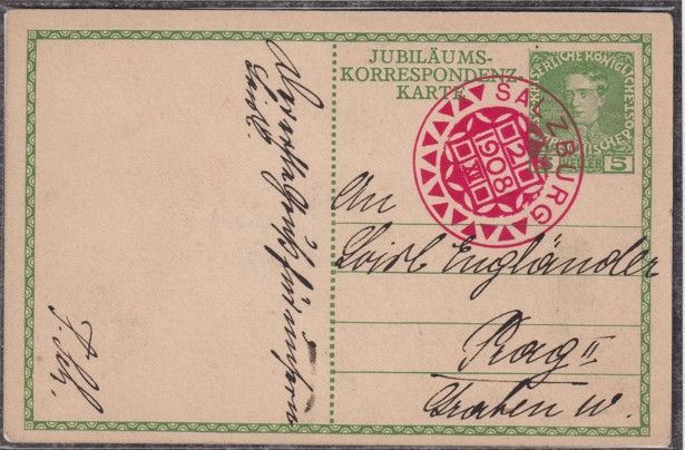 Červené razítko SALZBURG 2.XII.1908, německý text, na Jubilejní dopisnici, vydání 1908 – německý text, odesláno 2.12.1908 z Salzburgu do Prahy.