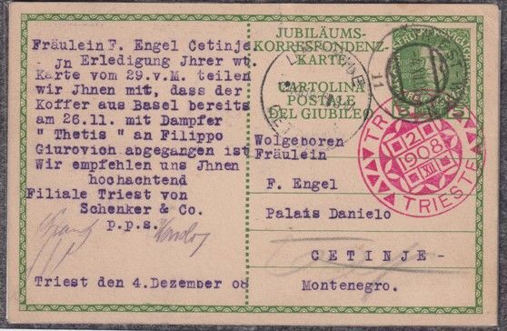 Červené razítko TRIEST*TRIESTE 2.XII.1908, německo – italský text, na Jubilejní dopisnici, vydání 1908 – německo – italský text, odesláno 4.12.1908 z vlaku Terst – Vídeň do Cetinje (Černá Hora), příchozí razítko 6.12.1908.