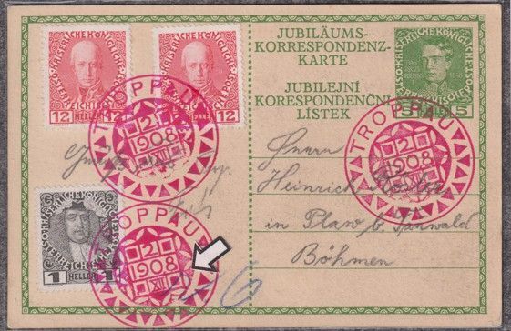 Červené razítko TROPPAU 2.XII.1908, německý text, na Jubilejní dopisnici, vydání 1908 – německo –český text, odesláno doporučeně 2.12.1908 z Opavy do Plané u Tanvaldu, správný tarif : 5+25 hal., 2 barevná přídavná frankatura.