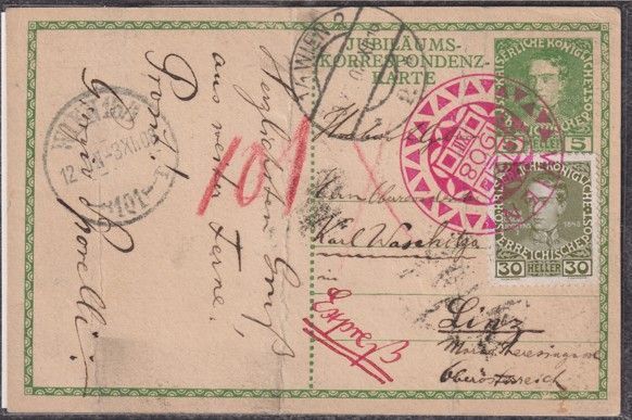 Červené razítko WIEN 2.XII.1908, německý text, na Jubilejní dopisnici, vydání 1908 – německý text, odesláno express 2.12.1908 z Vídně do Lince, po Vídni potrubní poštou číslo 2-101, správný tarif : 5+30 hal.