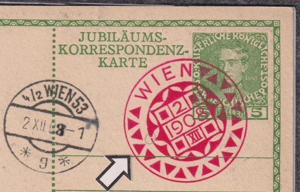 Jubilejní dopisnice, vydané 18.8.1908 -78. narozeniny FJI., (i mnoho dalších celin),byly předem razítkovány pamětním razítkem v červené barvě s datem 2. XII. 1908 (oficiální datum vydání jubilejních dopisnic, den nástupu FJI. na trůn) a označením hlavních zemských měst (14 měst) s přirážkou 15 h.