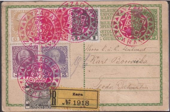 Červené razítko ZADAR*ZARA 2.XII.1908, německo – italský text, na Jubilejní dopisnici, vydání 1908 – německo – slovinsko – italský text, odesláno doporučeně 2.12.1908 z Zadaru do Tivat /Toedo (Dalmácie, nyní Černá Hora), správný tarif : 5+25 hal., 5 barevná přídavná frankatura.
