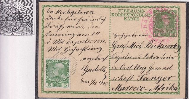 Červené razítko GRAZ 2.XII.1908, německý text, na Jubilejní dopisnici, vydání 1908 – německý text, odesláno 2.12.1908 z Štýrského Hradce (břevnové razítko), do Tangeru (Maroko), správný tarif : 5+5 hal., příchozí razítko : vzadu.