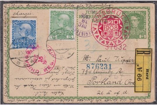 Červené razítko INNSBRUCK 2.XII.1908, německý text, na Jubilejní dopisnici, vydání 1908 – německý text, odesláno doporučeně 3.12.1908, z Hardu (Vorarlbersko) do Portlandu (USA), správný tarif : 5+30 hal., 2 barevná přídavná frankatura, příchozí razítka : 15.+18.12.1908.