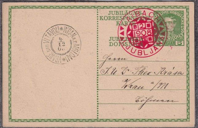 Červené razítko LAIBACH*LJUBLANA 2.XII.1908, německo – slovinský text, na Jubilejní dopisnici, vydání 1908 – německo – slovinský text, odesláno 2.12.1908 z Lublaně do Vraného nad Vltavou, příchozí razítko : 4.12.1908.
