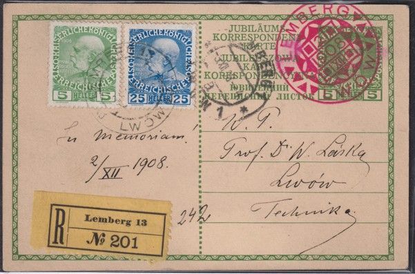 Červené razítko LEMBERG*LWOW 2.XII.1908, německo – polský text, na Jubilejní dopisnici, vydání 1908 – německo –polsko – rusínský text, odesláno doporučeně 3.12.1908 z Lvova do Lvova, správný tarif : 5+30 hal., 2 barevná přídavná frankatura,příchozí razítko : 3.12.1908.