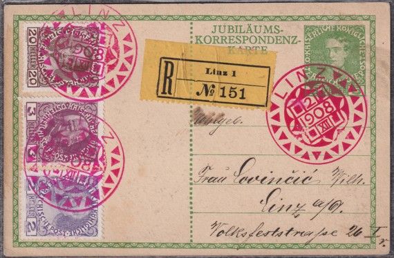 Červené razítko LINZ 2.XII.1908, německý text, na Jubilejní dopisnici, vydání 1908 – německý text, odesláno doporučeně 2.12.1908, z Lincre do Lince, správný tarif : 5+25 hal., 3 barevná přídavná frankatura